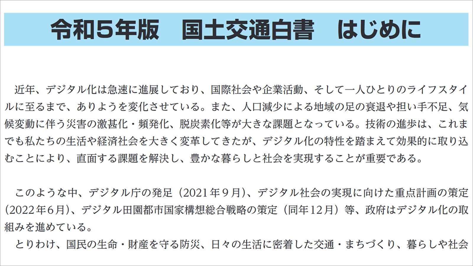 2023年6月30日に公開された国土交通白書。23年版の白書で、国土交通省が大きく取り上げたテーマは、「デジタルトランスフォーメーション(DX)」だ。白書の冒頭から国土交通分野のデジタル化をうたい、その具体的な対象として、防災やまちづくり、交通といった領域を提示。それぞれの分野に対する施策を説明している。これらの施策は、今後の建設産業における道しるべとなる。