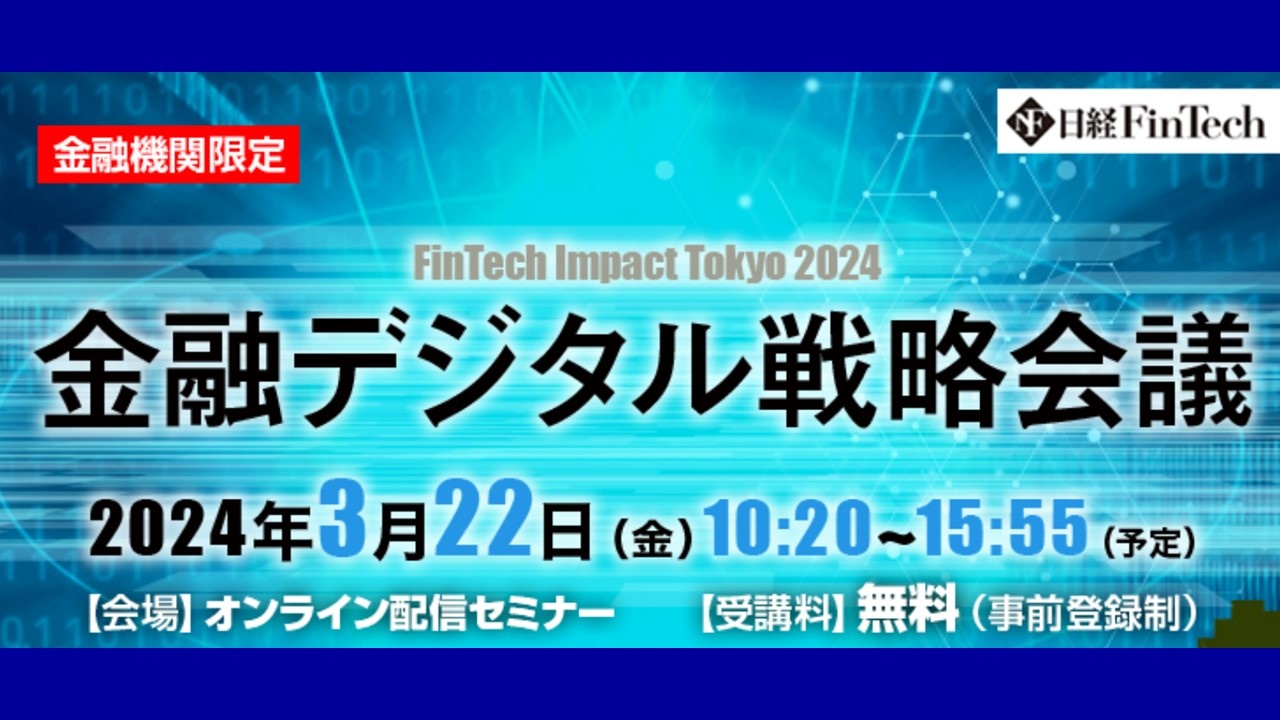 日経FinTechは2024年3月に「金融デジタル戦略会議 -FinTech Impact Tokyo 2024 Springー」を開催します。日本の銀行や証券会社、保険会社、カード/決済会社などの経営層、IT・デジタル部門の責任者の方々などを対象に、金融業界におけるDXの先進事例、今後直面する課題やその解決策などを紹介します。