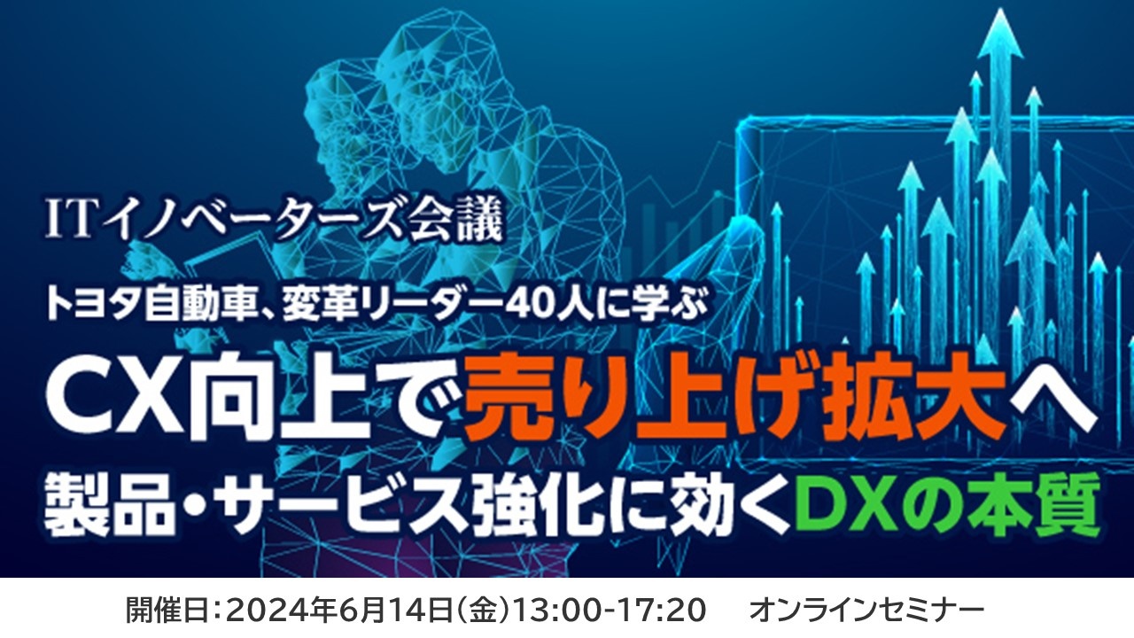 | イベント名 | ITイノベーターズ会議 トヨタ自動車、変革リーダー40人に学ぶ CX向上で売り上げ拡大へ 製品・サービス強化に効くDXの本質 |