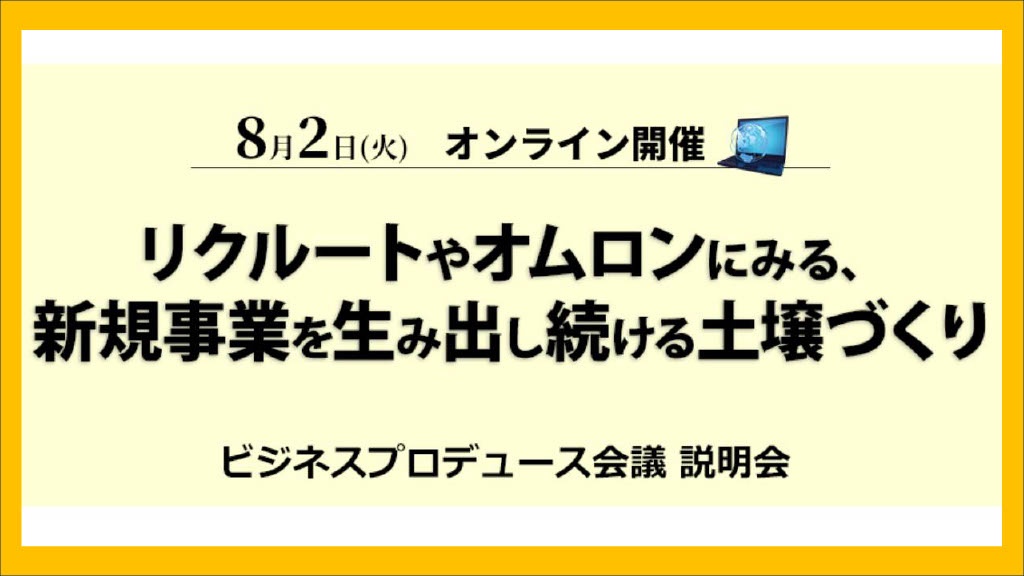 今回はビジネスプロデュース会議 2023年度向け説明会をオンラインで開催します。 説明会では、ビジネスプロデュース会議のプログラムの「今なぜ、ビジネスプロデュースなのか」、 「事業創造における課題」、「リクルートRingを題材に新規事業を生み続ける仕組み」、「オムロンが目指す両利きの経営」などから エッセンスを取り出して、ご紹介します。 ぜひご参加ください。
