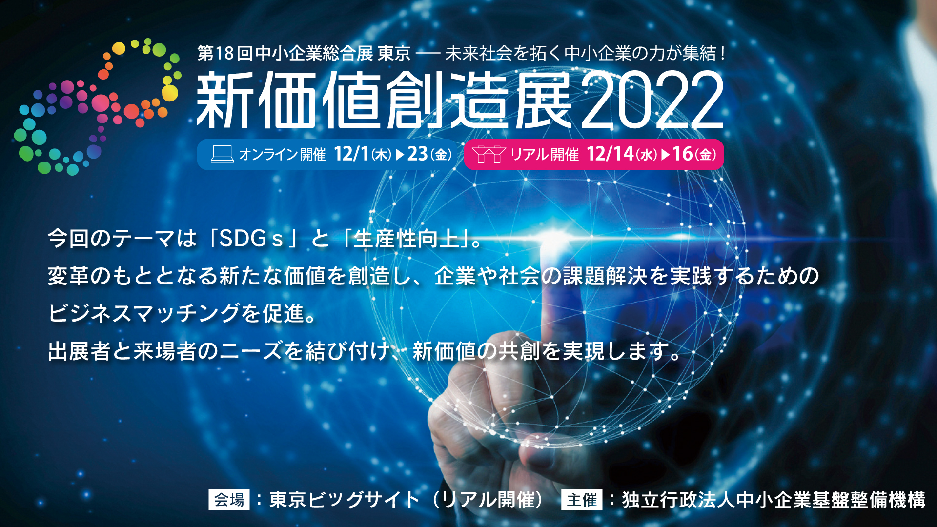 新価値創造展は、全国の中小企業・ベンチャー企業の出展者と、全国から一堂に集結する幅広い業種の来場者や、 出展者同士による新しい出会いや情報などがつながり、新たな価値を生み出すビジネスマッチングイベントです。 大手企業をはじめ、幅広い業種と経営者の方が多数来場します。