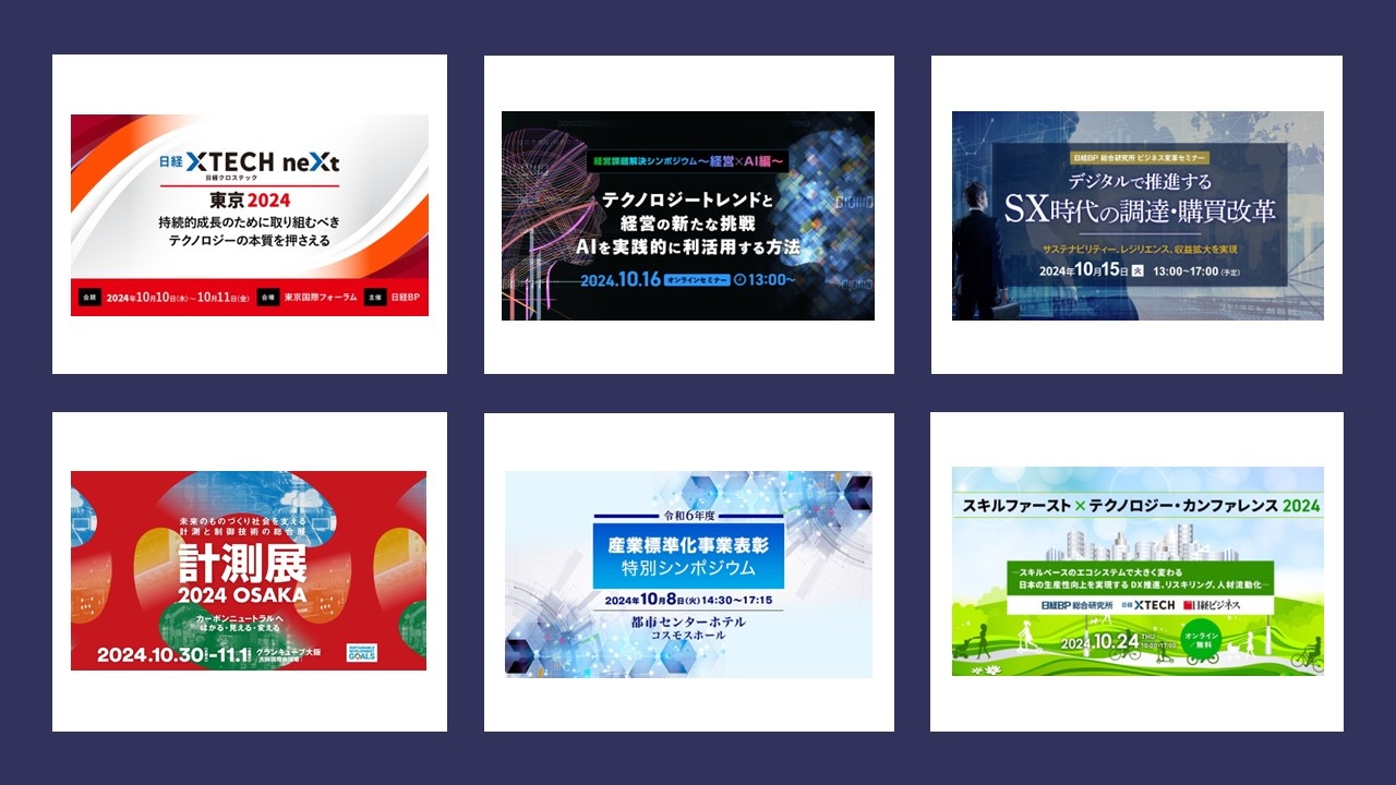 日経BPイベント&セミナー(NES)は、ビジネスの継続、あるいはさらなる高みを目指し、先進技術や成功事例、業界トレンド、キーマンなど、最新情報に出合えるイベント、セミナーが見つかります。以下、申し込み可能な10月開催予定の主なイベントのラインアップです(10月1日時点)。今月は「日経クロステックNEXT 東京 2024」(10~11日)「計測展2024 OSAKA」(30日~11月1日)など、ビジネスの課題解決に役立つイベントが多数開催されます。「デジタルで推進するSX時代の調達・購買改革」(15日)「テクノロジートレンドと経営の新たな挑戦 AIを実践的に利活用する方法」(16日)などSXやAI関連のイベントにも注目です。気になるイベントをクリックして詳細ページをご覧ください。