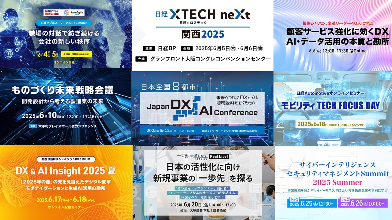 今月もDX&AIをテーマにした数多くのイベントが開催されます。「日経クロステックNEXT 関西 2025」(5~6日)、「ITイノベーターズ会議 顧客サービス強化に効くDX AI・データ活用の本質と勘所」(6日)、「Japan DX/AI Conference ≪広島≫」(12日)、「DX & AI Insight 2025 夏」(17~18日)など。そのほか、職場の対話や働き方などがわかる「職場の対話で紡ぎ続ける会社の新しい秩序」(4日)、「WOMAN EXPO 2025」(7日)、セキュリティ対策を考える「サイバーインテリジェンス セキュリティマネジメントSummit 2025 Summer」(25日)など、ビジネス課題の解決に役立つイベントが多数ラインアップされています。