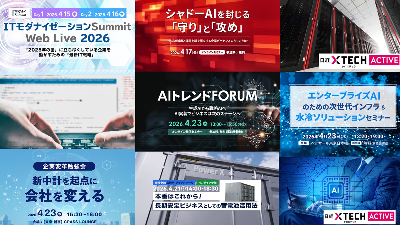 4月もAI関連のイベント、セミナーが多数。シャドーAIに対峙し、生成AIの力を最大限に引き出す「シャドーAIを封じる『守り』と『攻め』」(17日)、AIがもたらすビジネスモデルの変革をテーマにした「AIトレンドFORUM」(23日)、そのほか「エンタープライズAIのための次世代インフラ&水冷ソリューションセミナー」(23日)などが続きます。