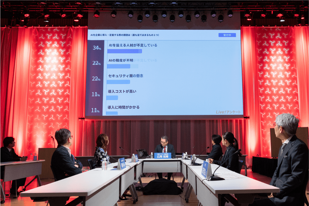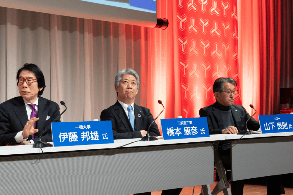 写真(左):パネルディスカッションに登壇した、一橋大学・CFO教育研究センター長の伊藤邦雄氏、川崎重工業・社長の橋本康彦氏、リコー・会長の山下良則氏。写真(右):会場では、視聴者が参加できるリアルタイムのアンケートシステムを活用して、議論の方向性を決めた。