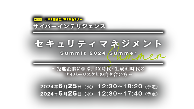 サイバーインテリジェンス セキュリティマネジメントSummit 2024 Summer ~先進企業に学ぶ、DX時代・生成AI時代のサイバーリスクとの向き合い方~ |