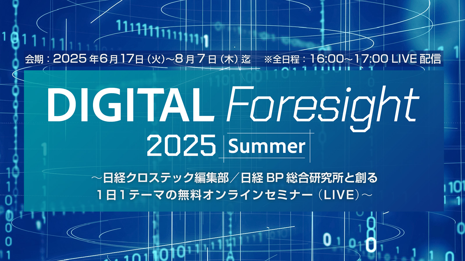 「DIGITAL Foresight」は企業のビジネス変革に役立つ注目のテーマやIT技術トレンドを日経クロステックの編集部員と日経BP 総合研究所の研究員が1日、1テーマ、1時間でコンパクトにわかりやすく解説するセミナー。6月17日(火)~8月7日(木)までの会期中、火曜日と木曜日の夕方16:00~17:00の時間帯に番組を無料配信する予定です。