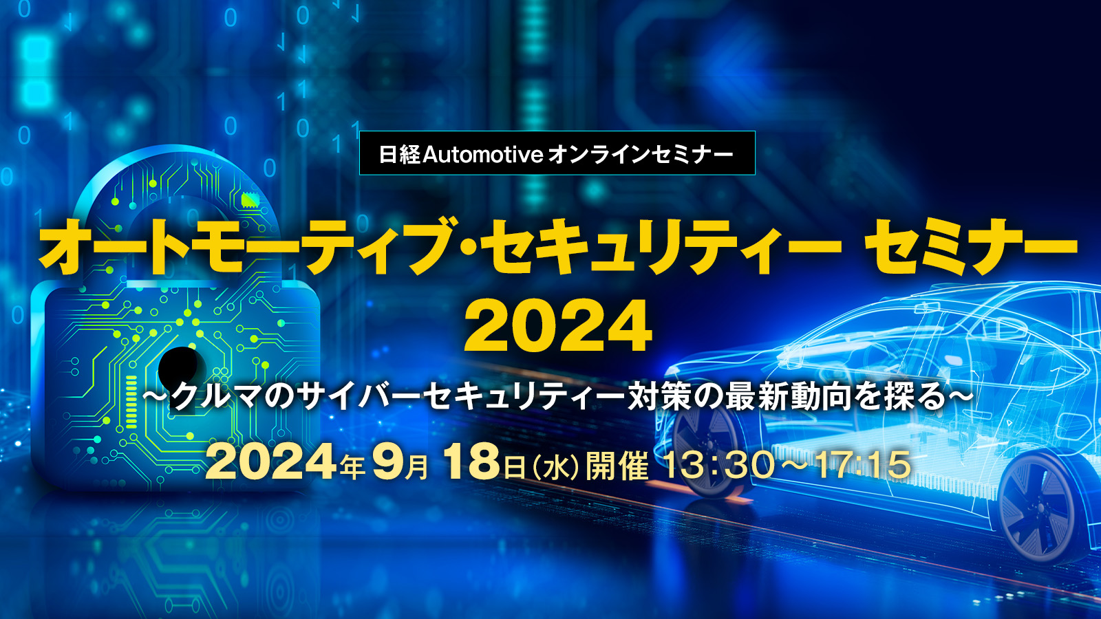 日経Automotiveでは、「クルマのサイバーセキュリティー対策」をテーマにオンラインセミナーを実施いたします。自動車におけるサイバーセキュリティー対策の状況をお伝えすると共に、「安全・安心」なクルマをつくるために、解決すべき課題を共有いたします。