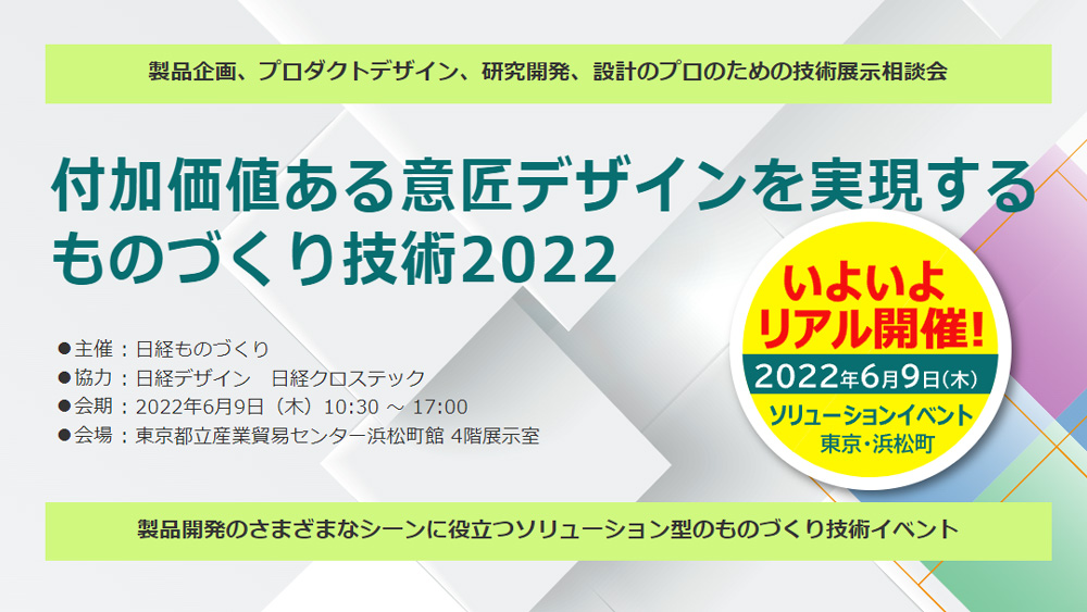 リアルならではのこの機会を課題解決にどうぞご活用ください! 加工や素材のサンプルを実際に「見て」技術の強みを「聞いて」出展社に気軽に「相談できる」、技術オリエンテッドなコミュニケ―ションの場です。