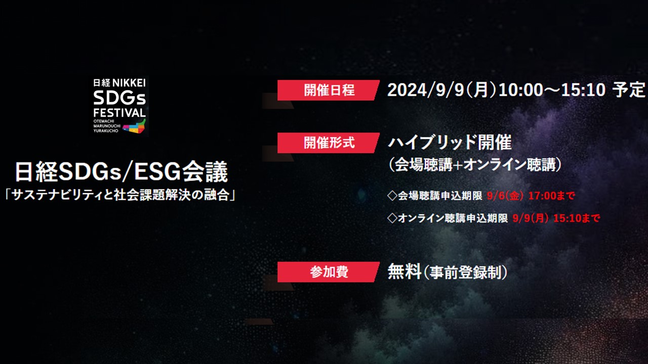 今回の日経SDGs/ESG会議のテーマは「サステナビリティと社会課題解決の融合」。サステナビリティー活動をどのように本業に生かすのか。様々な産業に浸透するSXと持続成長のあり方、また企業がSXを商品展開やサービスに組み込む事例を報告します。地道な活動が事業強化と企業価値向上につながります。本会議からそのヒントを探ってください。