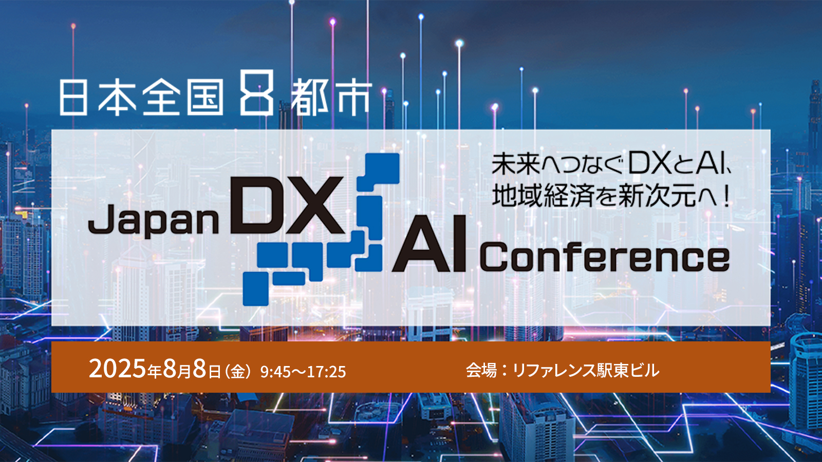 地域経済の持続可能な成長を目指し、技術革新とその具体的な応用についての知識とノウハウを共有し、新しいビジネスチャンスを創出するためのヒントを提供するべく「日本全国 8都市 Japan DX/AI conference」を開催いたします。