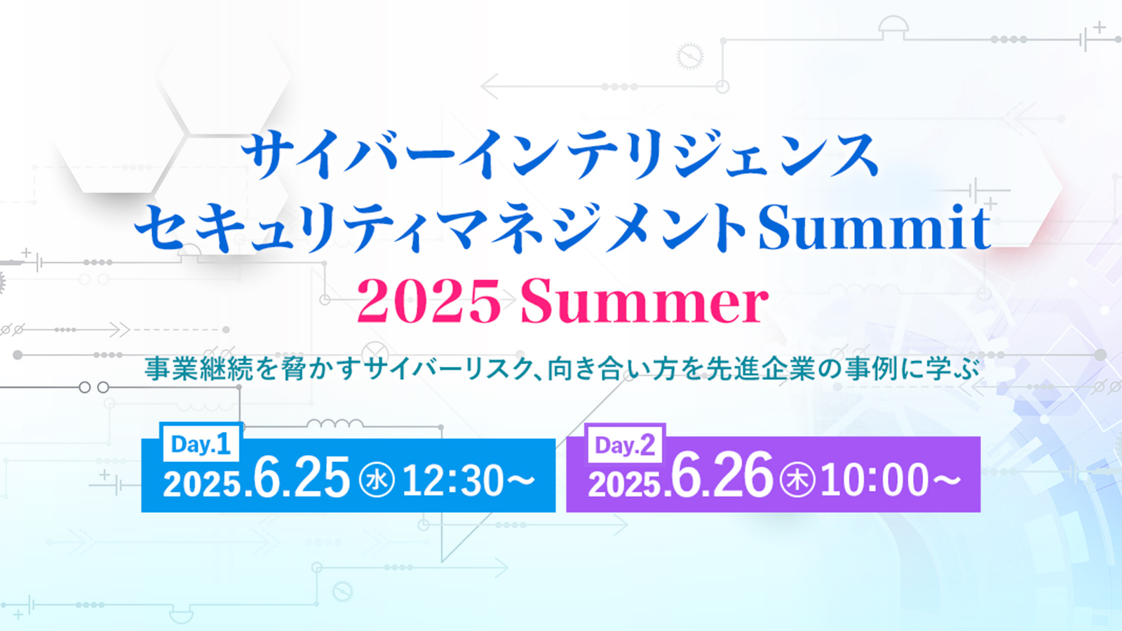 企業や行政機関に必要なのは、サイバーリスクが生じてもビジネスを止めない「サイバーBCP」を確立すること。本サミットでは、日々サイバーリスクに対峙する企業・組織の方による「生」の事例講演を通して、皆様に「自分たちなりのセキュリティマネジメント」を考える機会を提供します。