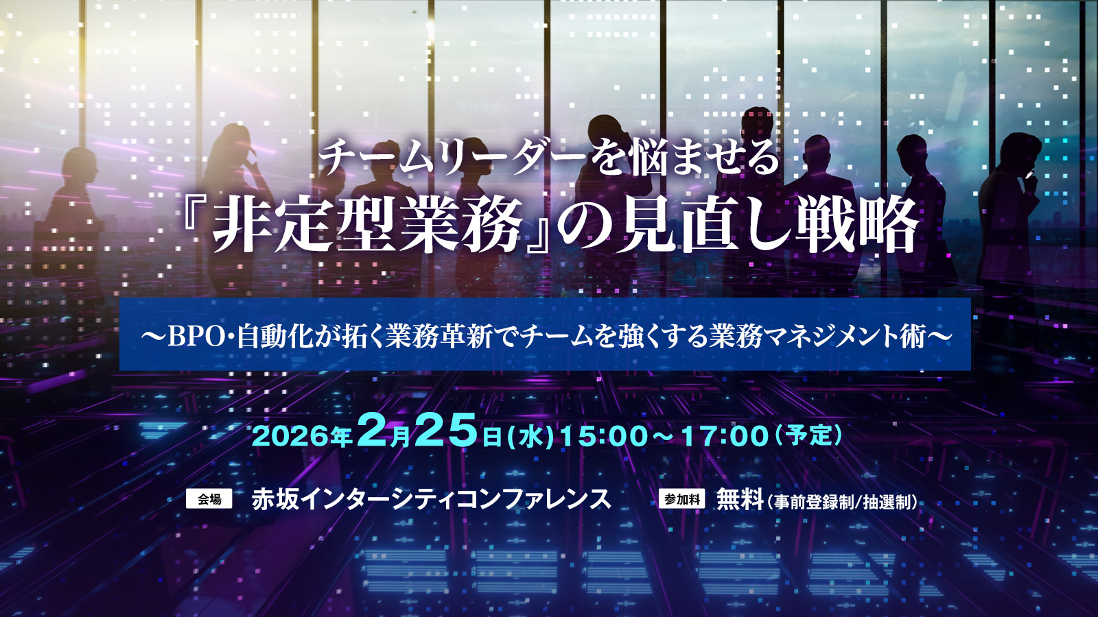 激動の時代、チームリーダーを悩ませ、生産性停滞にも繋がる課題が生まれやすい『非定型業務』。本セミナーでは、BPOや自動化を戦略的に活用し、この課題を打開。チームを着実に強化する実践的なマネジメント術を提示します。