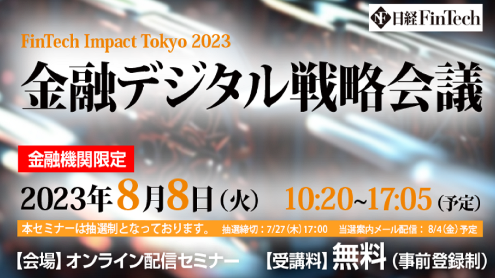 日経FinTechは2023年8月に「金融デジタル戦略会議 -FinTech Impact Tokyo 2023 Summerー」を開催します。日本の銀行や証券会社、保険会社、カード/決済会社などの経営層、IT・デジタル部門の責任者の方々などを対象に、金融業界におけるDXの先進事例、今後直面する課題やその解決策などを紹介します。