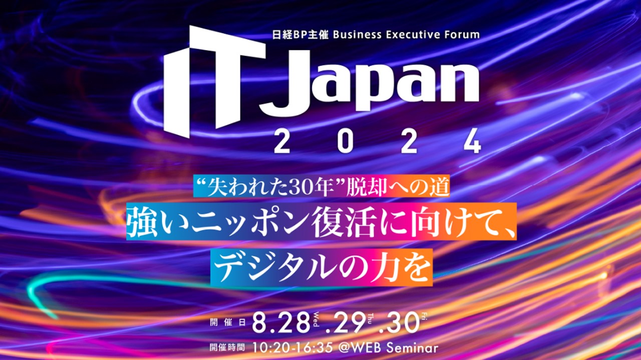IT Japan 2024では、DX先進企業やIT/コンサルティング企業の経営トップ、専門家、有識者の知見を集積し、「強いニッポン」の復活に向けた方策について提言します。いま事業を伸ばす攻めのDXが必要です。生成AIをはじめデジタル技術を最大限に活用し、イノベーション創出など新たな価値を追求する方向に大きく舵を切る、2024年はまさにそのタイミングの年にしなければなりません。日本経済に作動を始めた好循環を持続させ、再び強い日本を取り戻す