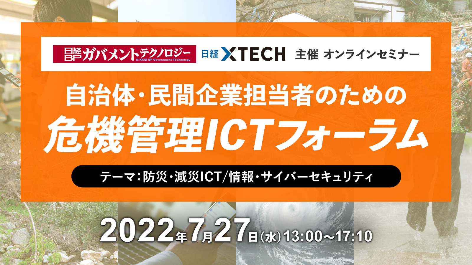 コロナの蔓延、大地震、ゲリラ豪雨による川の氾濫など、ここ数年頻発する大規模災害を受けて、ICTを駆使して危機を乗り越えるための危機管理担当者向けセミナーになります。