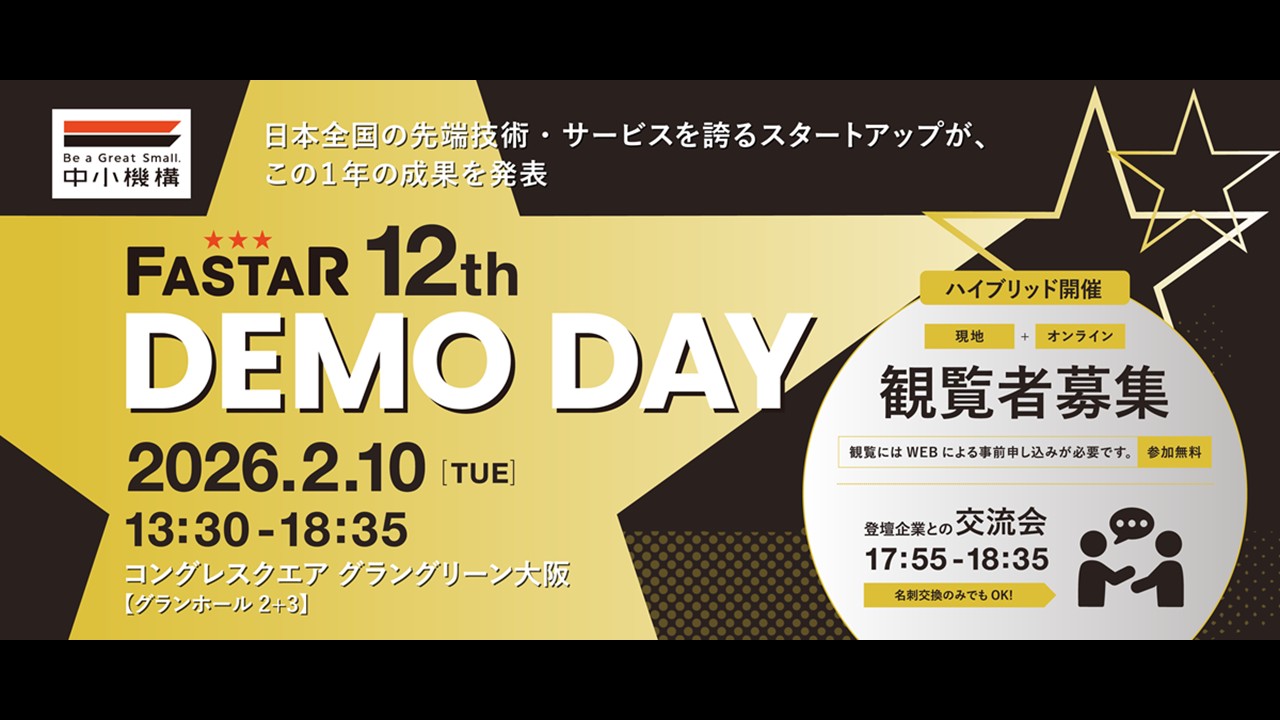 ユニコーンやIPO、地域を担っていく中核企業を創出すべく、その予備軍となるスタートアップを支援するプログラム「FASTAR」。第12期として選抜された20社のスタートアップが、1年間のプログラムを通じ練り上げられた事業計画と事業成果を発表いたします。