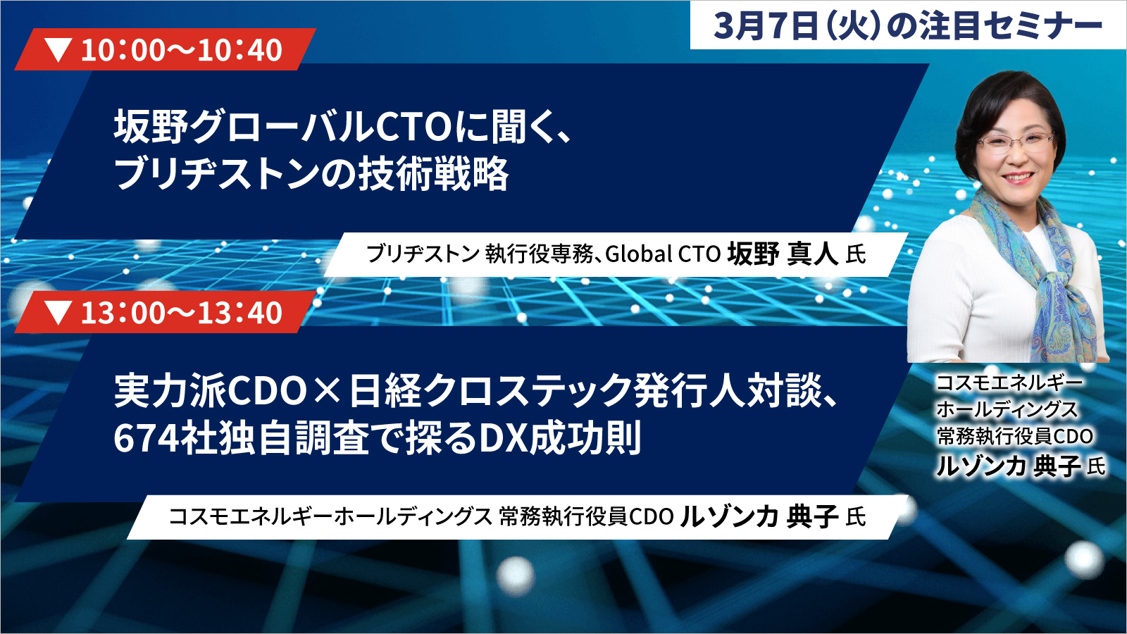 お知らせ 3月7日(火)の注目セミナーのご案内 更新日:2023.3.7 URLをコピーしました 「日経クロステックNEXT オンライン 2023春」では、日経クロステック編集長陣が注目技術の動向や本質、メリット、リスクを解説。DX先進企業の経営幹部や変革リーダーが、DX成功の法則を明かします。 3月7日(火)開催のセミナー