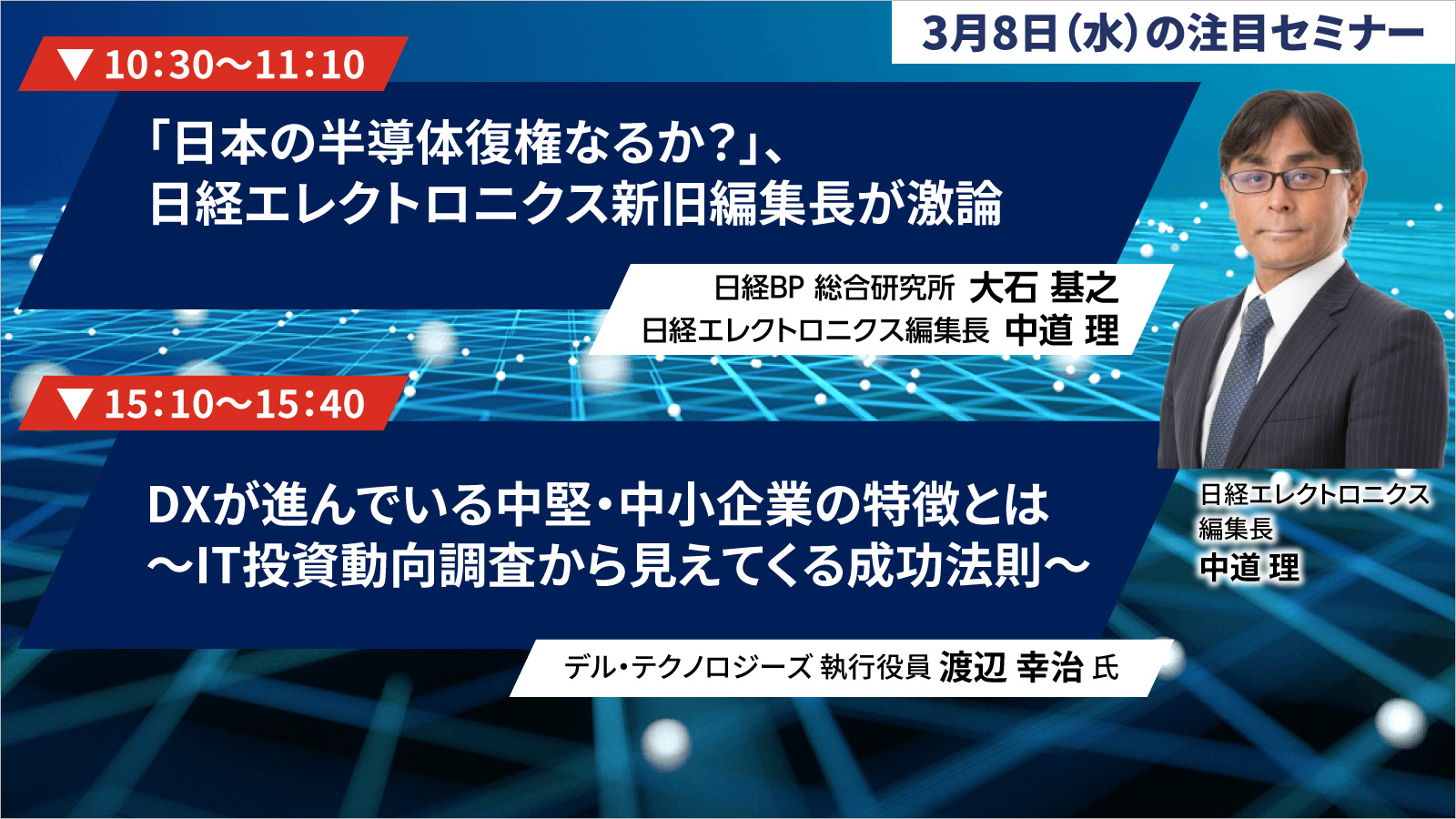 お知らせ 3月8日(水)の注目セミナーのご案内 更新日:2023.3.7 URLをコピーしました 「日経クロステックNEXT オンライン 2023春」では、日経クロステック編集長陣が注目技術の動向や本質、メリット、リスクを解説。DX先進企業の経営幹部や変革リーダーが、DX成功の法則を明かします。 3月8日(水)開催のセミナー